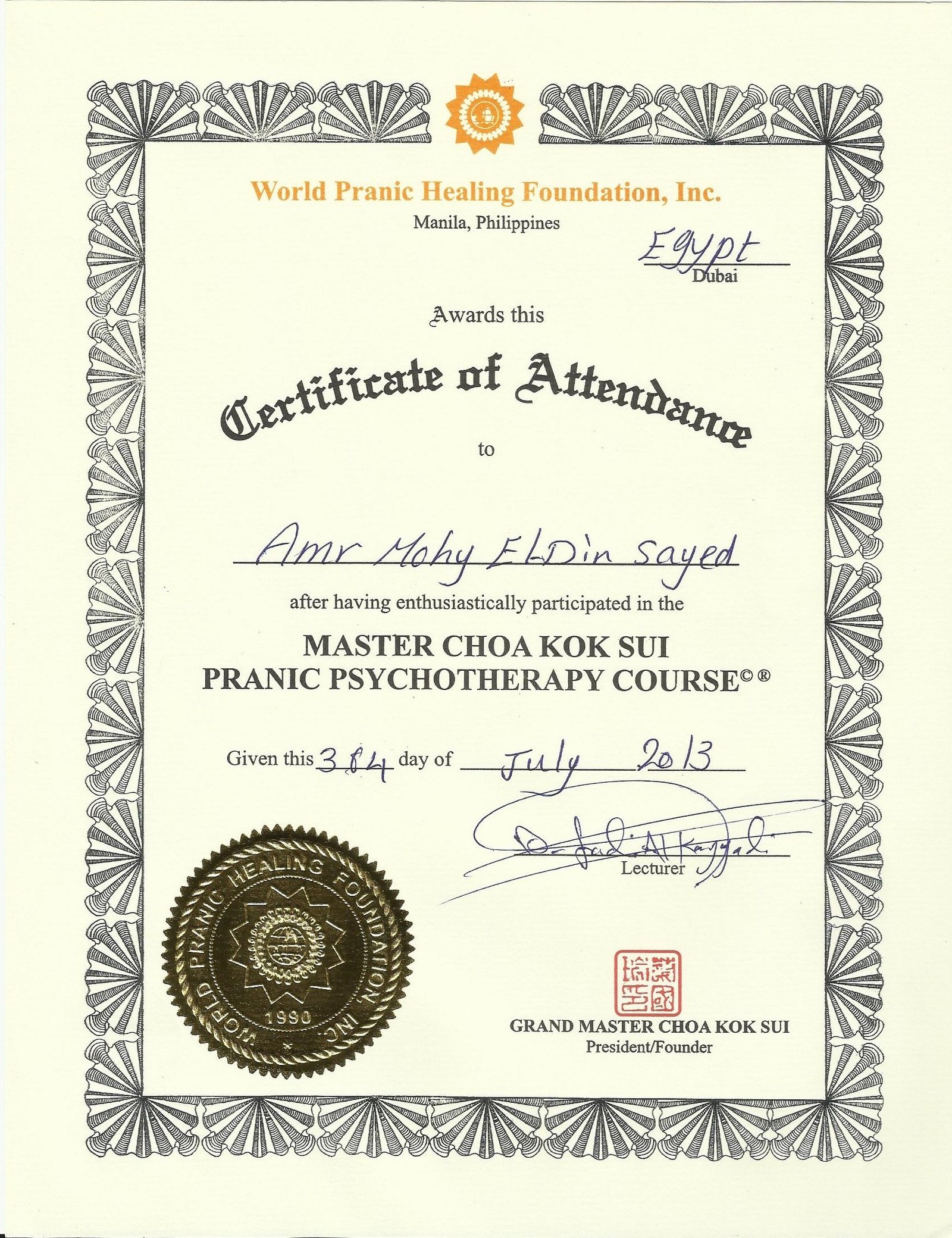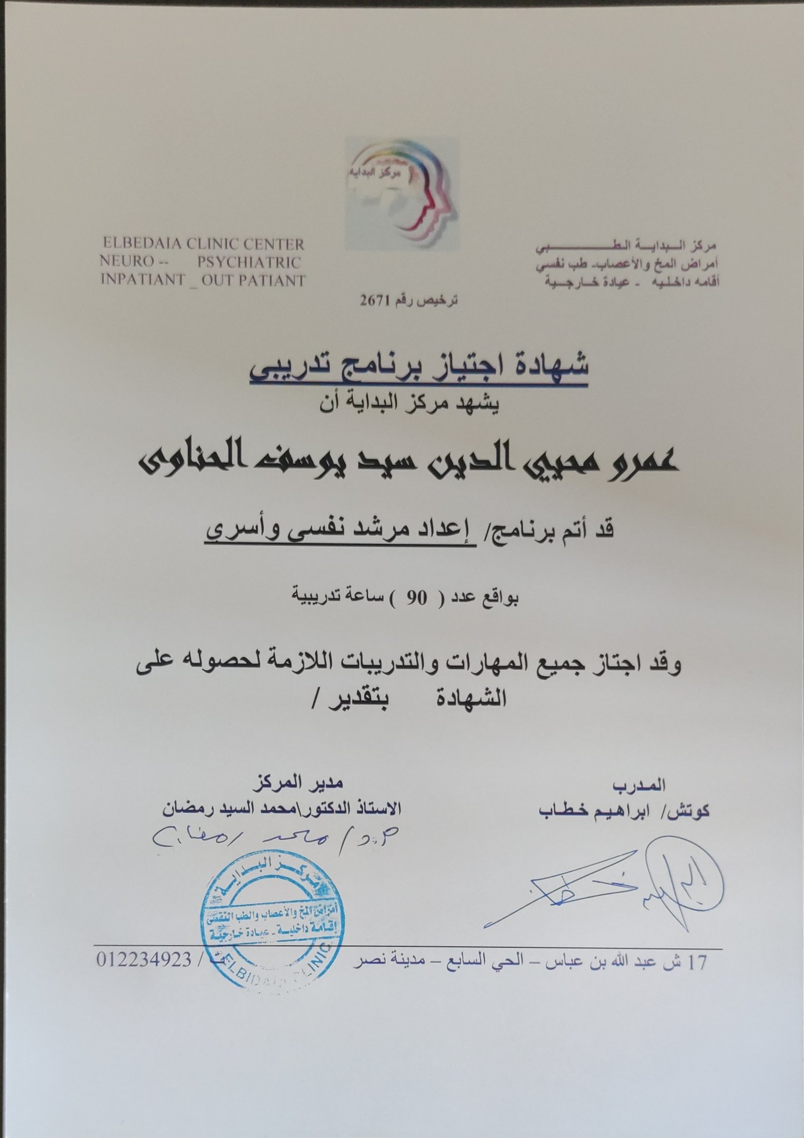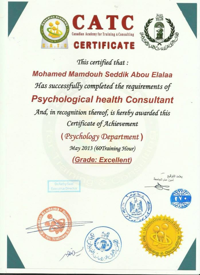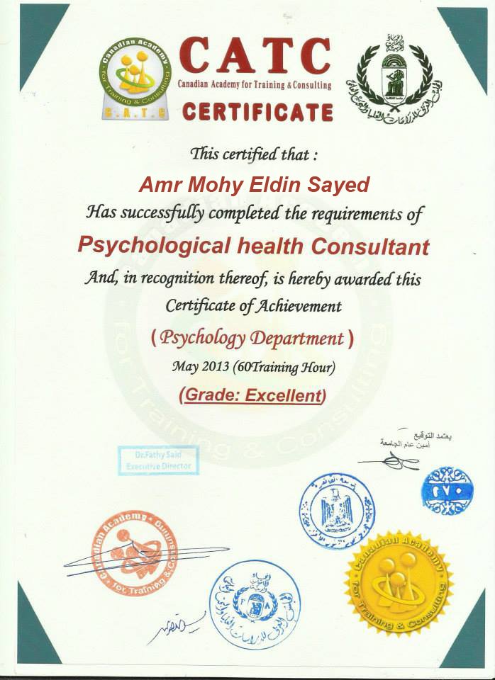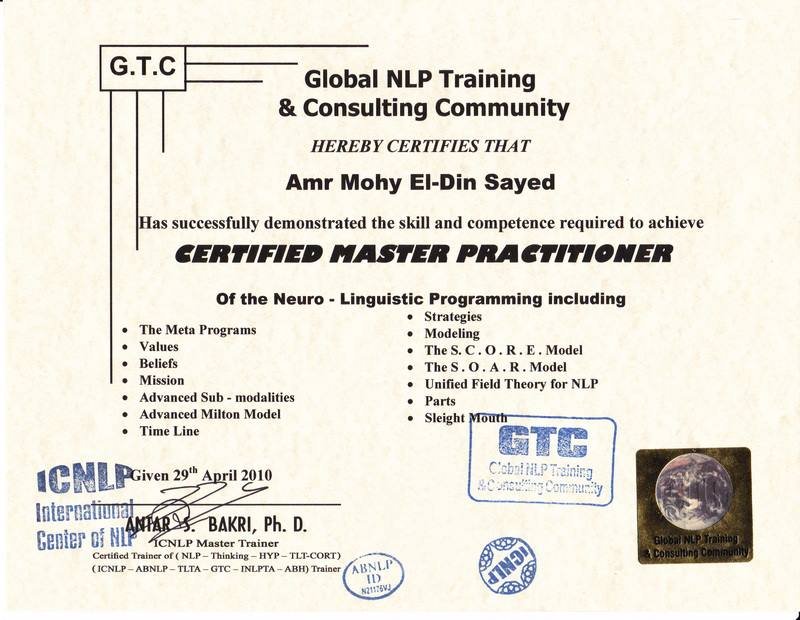 كما انه مدرب و ممارس متقدم لعلوم البرمجة اللغوية العصبية و التنويم الايحائى و العلاج بخط الزمن