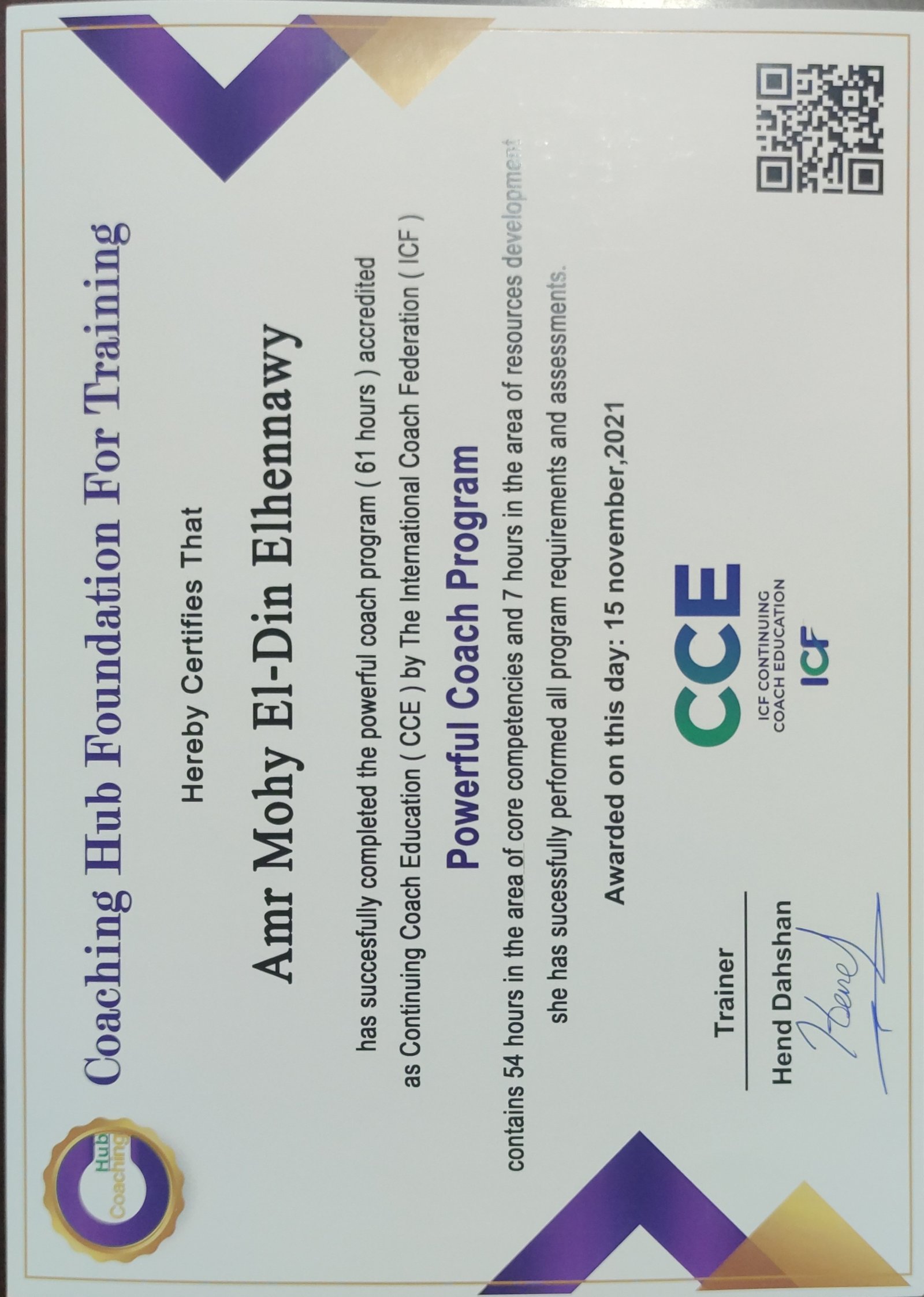 كما انه حاصل على رخصة التدريب الدولية CPI