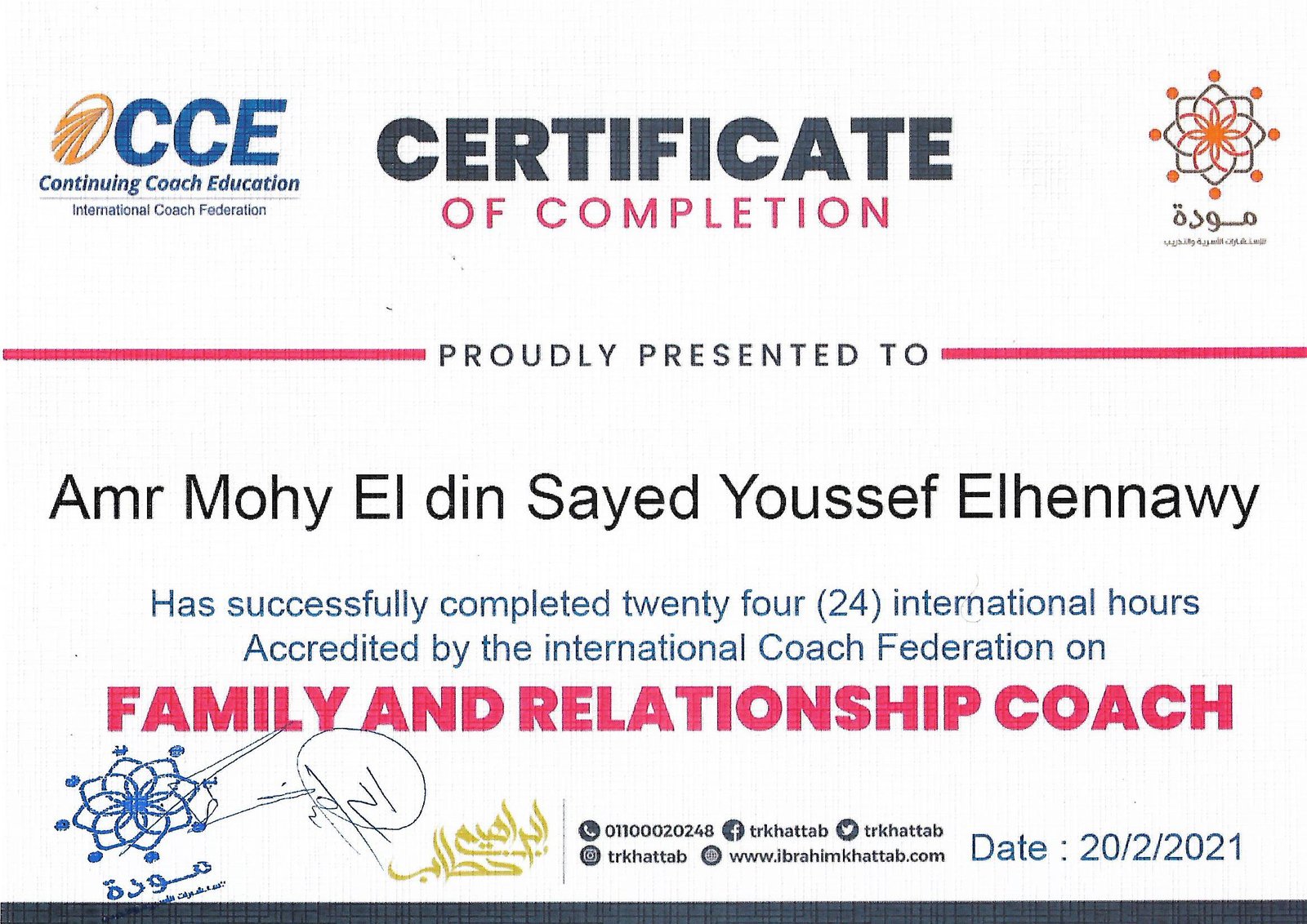 عمرو الحناوى مدرب معتمد من أكبر الجهات العالمية المعنية بالتطوير الذاتى و الكوتشنج